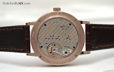Die Bewegung L051.1 Obwohl die Bewegung einfach ist, sieht sie nicht einfach aus. Die Dekoration ist großzügig und typisch für Lange Bewegungen. Im vertrauten Lange-Stil ist die meisten der Bewegung von einer Dreiviertel-Platte bedeckt, ein Merkmal, das Ferdinand Adolph Lange von der englischen Uhrmacherei übernommen hat, dann die vorrangigen.