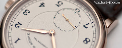 Inspiriert durch marine Chronometer Jenseits des Fallmaterials ist ein weiteres ungewöhnliches Merkmal das Zifferblatt. Die meisten 1815 Uhren, einschließlich der neuen Boutique Edition Chronograph , haben glatte Zifferblatt beendet. Das Honiggold 1815 ist interessanter, mit einer körnigen Oberflächenveredelung, die dazu bestimmt ist, die Beschaffenheit der silbernen Zifferblätter auf Weinlese-Marine-Chronometer hervorzurufen. Während die Wirkung ansprechend ist, unterscheidet sie sich von anderen 1815 Uhren, die ähnlich aussehen, die historische Inspiration ist verwirrt, da die 1815 ist auf Vintage Taschenuhren statt marine Chronometer modelliert.