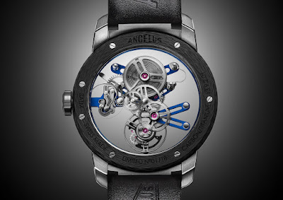Als Schwesterfirma des Bewegungsmachers La Joux-Perret hat Angelus das Glück, ungewöhnliche Bewegungen zu machen. Bald wird auf der Baselworld 2016 vorgestellt , das neue U20 Ultra-Skeleton Tourbillon ist ein Beispiel dafür, mit einer Saphirglas-Grundplatte und gebläuten Titanbrücken.