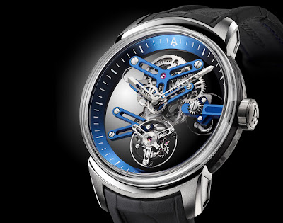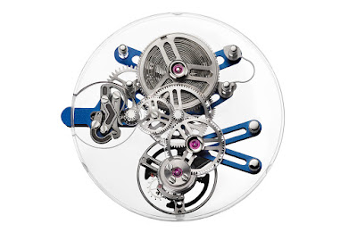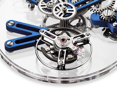 Die Zahnräder und Fässer sind an der Grundplatte verankert, die durch gebläute Titanbrücken, die offen gearbeitet wurden, um die Transparenz der Bewegung zu maximieren. Echo das Blau der Brücken ist der blaue Kapitel Ring für die Minute Spur um das Zifferblatt.